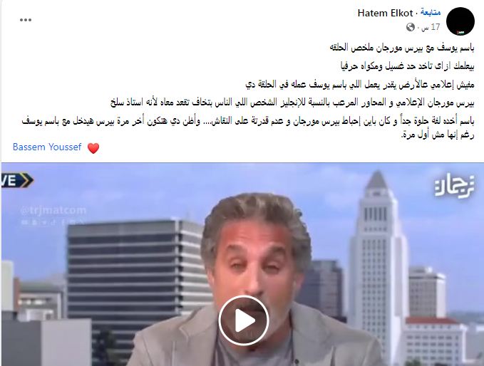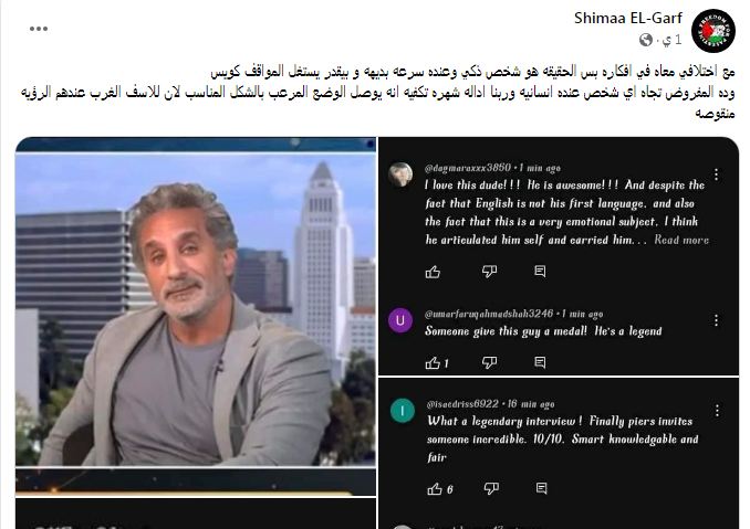 باسم يوسف، أشعل حواره مع المذيع البريطاني الشهير، بريس مورغان، حالة من الجدل على وسائل التواصل الاجتماعي بشكل سريع، بعدما انتقد خلاله السياسة الإسرائيلية في التعامل مع حرب غزة، بأسلوب احترافي هزت الرأي الغربي وأثار إعجاب كل مؤيدي الشعب الفلسطيني.