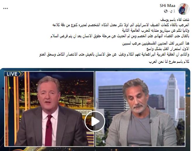 وحازت مقابلة يوسف، إعجاب الملايين خلال ساعات قليلة، وأشاد رواد مواقع التواص الاجتماعي بردود باسم، لتبنيه وجهة النظر المصرية والعربية الرافضة العدوان على الفلسطينيين أو تهجيرهم من غزة.