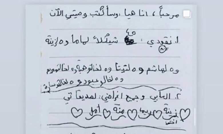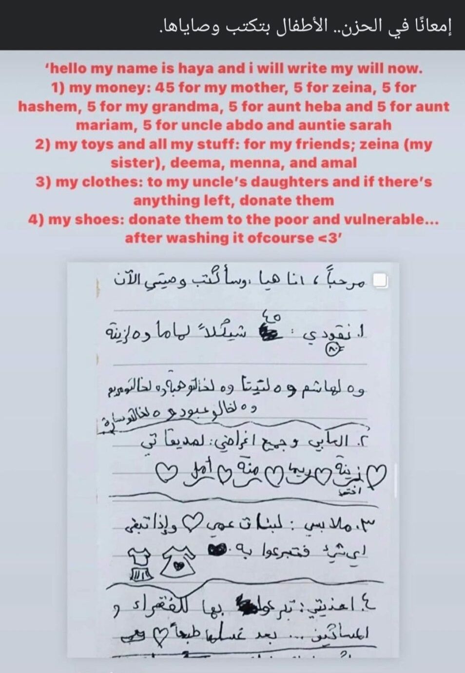 ووسط الضحايا والجثث في كل مكان، كانت الأعين عن ورقة صغيرة كتبتها طفلة تكاد تبلغ من العمر 8 سنوات وصيتها الأخيرة قبل أن تذهب إلى مثواها الأخير، وتم تداول هذه الورقة التي أخذت من كراسة طفلة فلسطينية حازت على تعاطف وأبكت ملايين من الأشخاص من حول العالم.