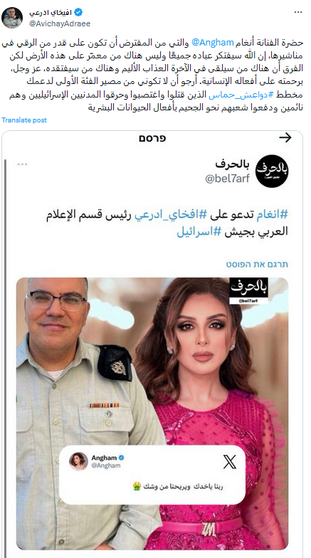 أنغام تلقن أفغاي متحدث الجيش الإسرائيلي درسًا في الأدب بعد تطاوله عليها