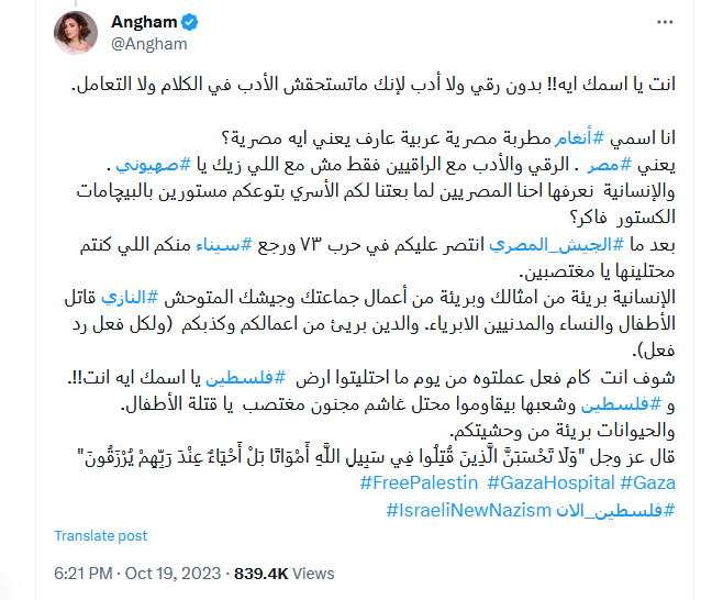 لترد عليه المطربة المصرية برسالة شديدة اللهجة وقالت: "إنت يا اسمك ايه!! بدون رقي ولا أدب لإنك ماتستحقش الأدب في الكلام ولا التعامل، أنا اسمي أنغام مطربة مصرية عربية عارف يعني إيه مصرية؟ يعني مصر.. الرقي والأدب مع الراقيين فقط مش مع اللي زيك يا صهيوني".