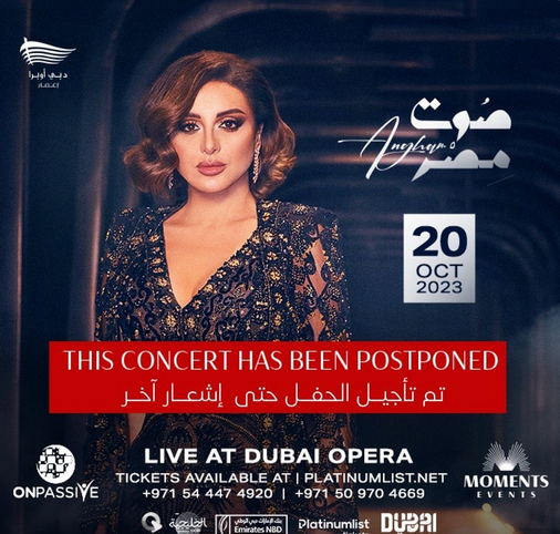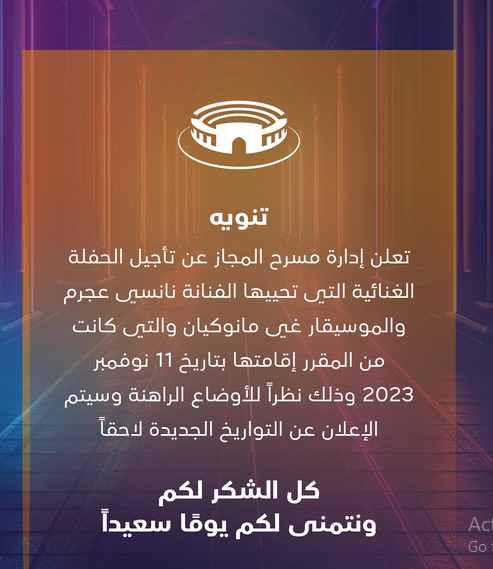 كما تم تأجيل حفل الفنانة نانسي عجرم الذي كان سيقام في الـ 11 من نوفمبر القادم على مسرح المجاز