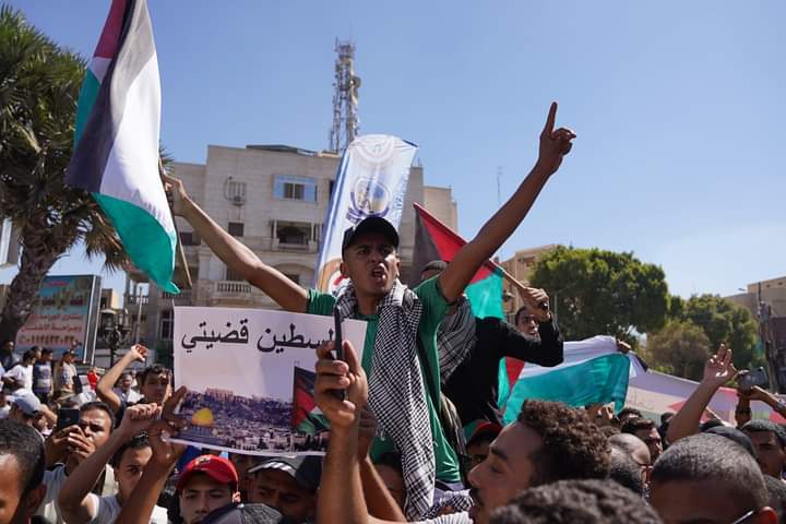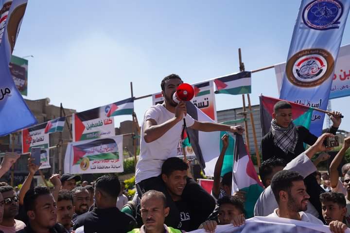 رفع المتظاهرين العلم المصري والعلم الفلسطيني مرددين الهتافات المناهضة للعدوان الإسرائيلي الغاشم والوحشي علي قطاع غزة وقتل الأبرياء من المدنيين من الأطفال والنساء والشيوخ مطالبين المجتمع بعدم الازدواجية في المعايير واحترام حق المدنيين وإدخال المساعدات الفورية لأهالي القطاع مرددين هتافات "بالروح بالدم نفديك يا أقصي و فلسطين عربية وتسقط تسقط إسرائيل ويسقط الكيان الصهيوني وكلنا فلسطين"