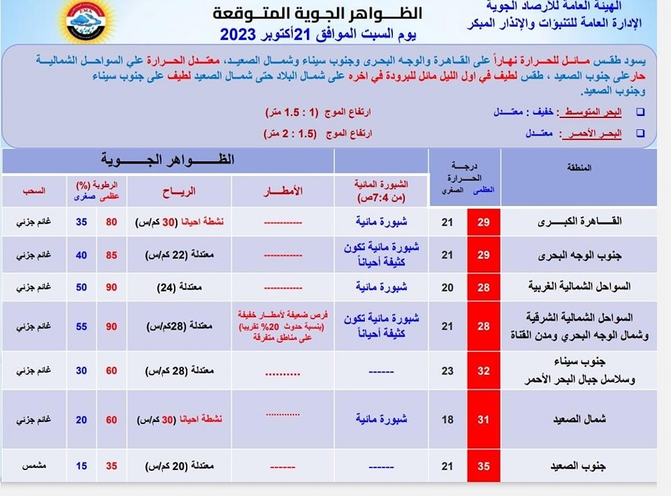 أعلنت الهيئة العامة لـ الأرصاد الجوية، عن حالة الطقس ودرجات الحرارة المتوقعة غدًا السبت، إذ أنه من المتوقع أن يسود طقس مائل للحرارة نهارًا على القاهرة الكبرى والوجه البحري وجنوب سيناء وشمال الصعيد.