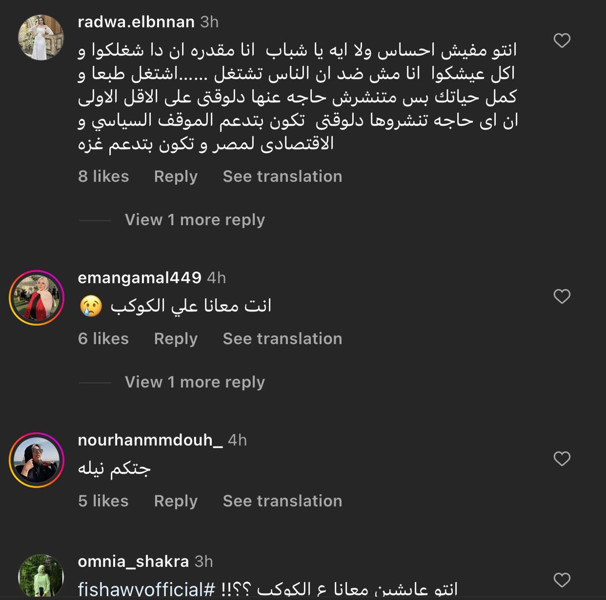 كما علق متابع آخر على منشور أحمد الفيشاوي وكتب: "إنت معانا على الكوكب؟"، وقال آخر: "كل حاجة الوقت ده بتبان قد ايه تافهه قدام اللي بيحصل في غزة".