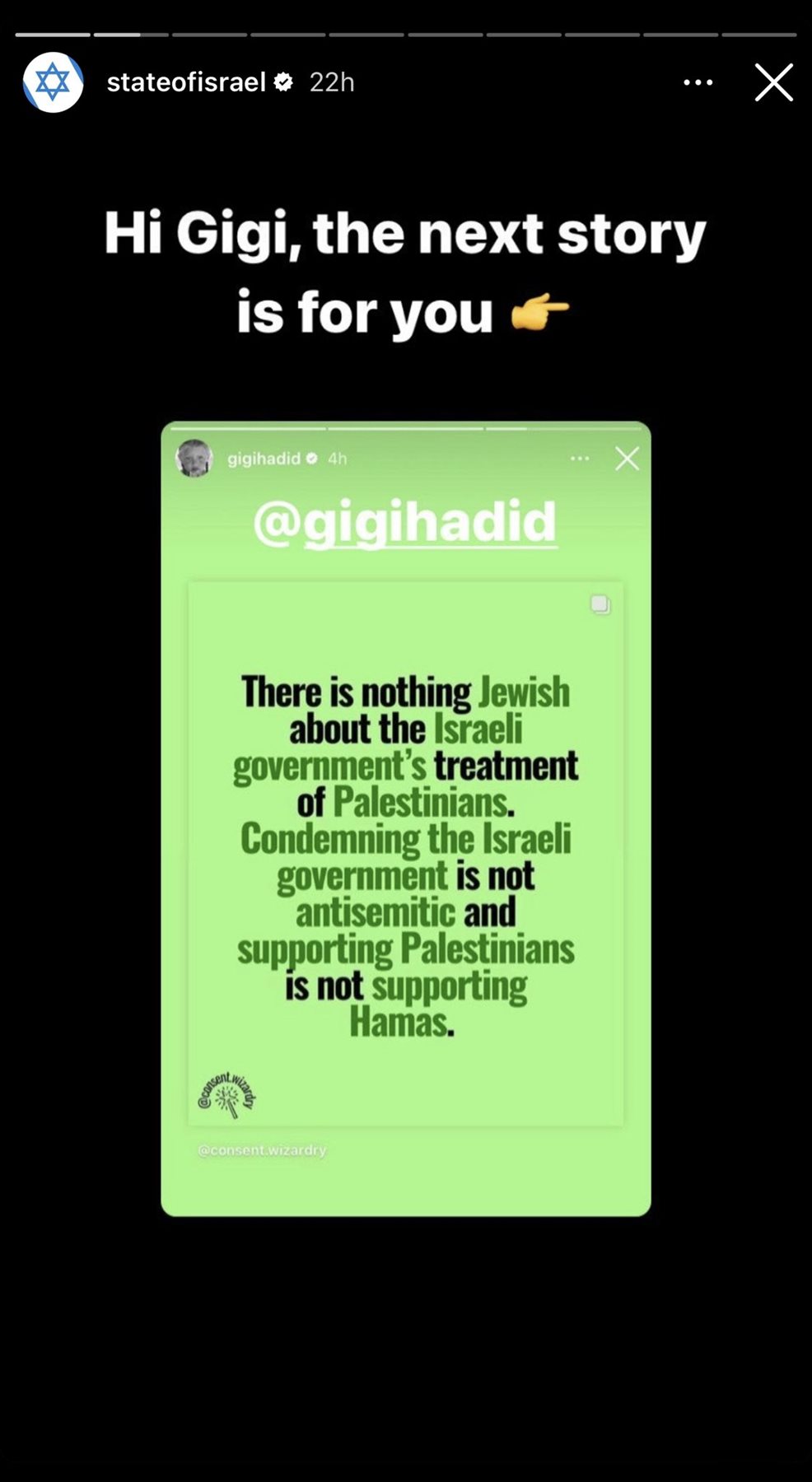 علقت عارضة الأزياء ذات الأصول الفلسطينية جيجي حديد، عن ضربات إسرائيل لقطاع غزة خلال الأيام الماضية، وقالت في بيان: "لا يوجد شيء يهودي في معاملة الحكومة الإسرائيلية للفلسطينيين، وإن إدانة الحكومة الإسرائيلية ليست معادية للسامية، ودعم الفلسطينيين لا يعني دعم حماس".