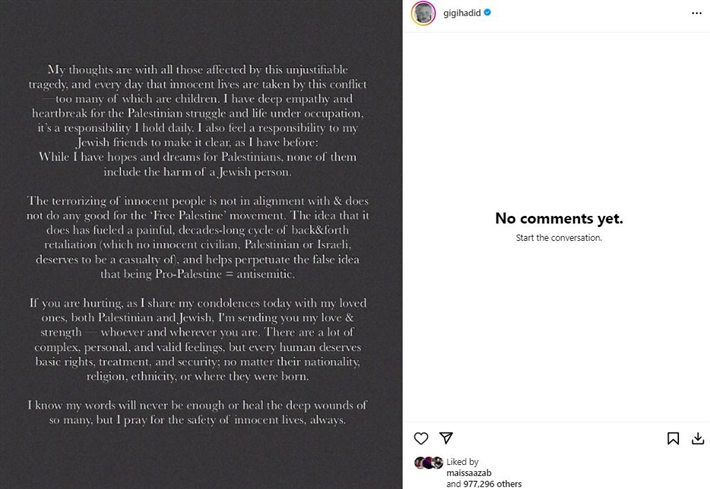 وأضافت جيجى حديد: "إذا كنت تتألم، وأنا أشارك تعازي اليوم مع أحبائي، الفلسطينيين، فإنني أرسل لك حبي وقوتي أينما كنت".