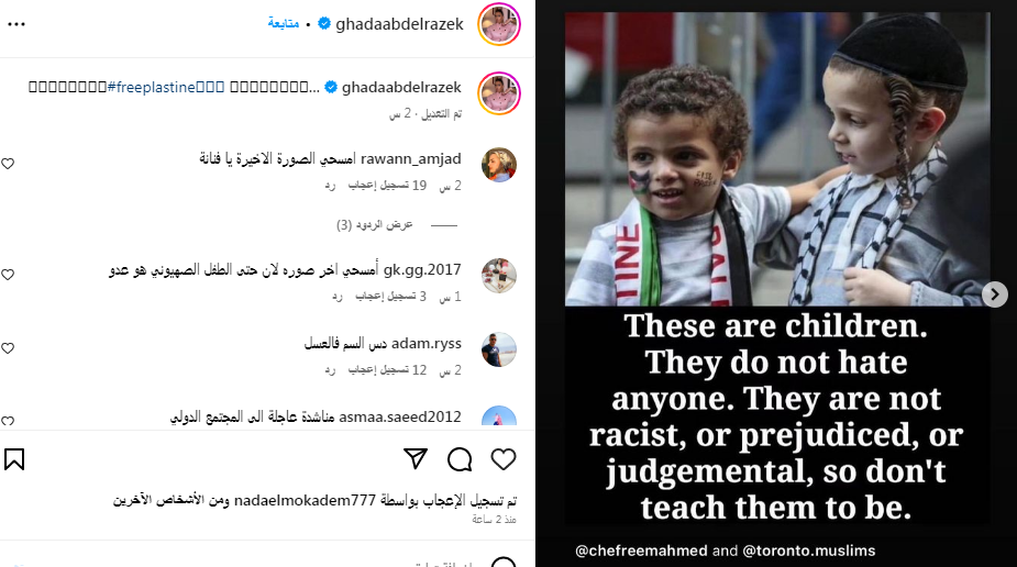 نشرت الفنانة غادة عبدالرازق مجموعة من الصور لدعم القضية الفلسطينية، خاصة بعد الأحداث المروعة التي شهدها قطاع غزة خلال الأيام الماضية، إلا أنها وقعت في فخ بعد نشرها صورة لطفل فلسطيني (يحمل علم فلسطين)، مع طفل إسرائيلي (بالزي اليهودي) ما جعل جمهور غادة ينتفض، ويطالبها بحذف هذه الصورة.