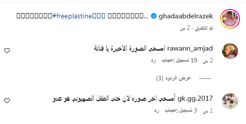 وسرعان ما انهالت عليها التعليقات وسط مطالبات بحذف الصورة والتي جاءت كالأتي، " امسحي الصورة الاخيرة يا فنانة"، " أمسحي اخر صوره لان حتى الطفل الصهيوني هو عدو"، " حافظين مش فاهمين. امسحي الصورة الاخيرة لانها خربت كلشي"، " بلاش والنبي احر صوره دي احنا مش ملايكه"، " شفت الصورة الاخيرة مسحت كل ما كان قبلها"، " امسحي الصورة الاخيرة"، " لا يمكن للصورة الاخيرة ان تكون واقع ف يوم من الايام لسبب بسيط ان المستعمر المحتل المستوطن لا ياتي بسلام ولا بخير الله يحمي الفلسطينية"، " اولا الصوره التانيه فبركه .. تانيا ااصورة التالته ما الها داعي .. ليكون يختي هم بين بعض عم بحكو هيك .. بدنا سلام وحب .. ينقلعوا من ارضهم .. حتى هدول الصغار بالمدارس عم بعلموهم انه اافلسطينين اعدائكم .. بلا فلسفة الدمقراطيه".