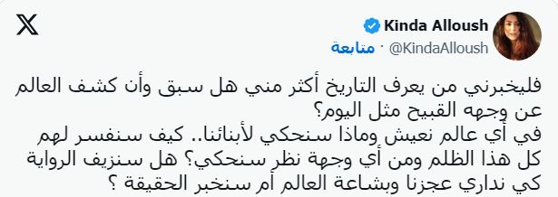 وكتبت الفنانة كندة علوش، في تدوينة عبر حسابها قائلة: "فليخبرني من يعرف التاريخ أكثر مني، هل سبق وأن كشف العالم عن وجهه القبيح مثل اليوم؟ في أي عالم نعيش وماذا سنحكي لأبنائنا؟ كيف سنفسر لهم كل هذا الظلم ومن أي وجهة نظر سنحكي؟ هل سنزيف الرواية كي نداري عجزنا وبشاعة العالم أم سنخبر الحقيقة ؟".