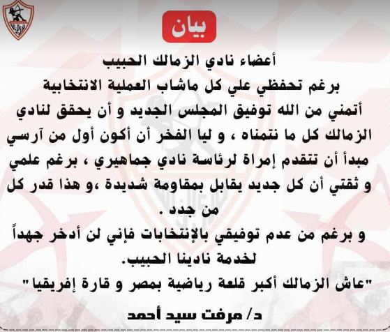 وجهت ميرفت السيد أحد المرشحين في انتخابات الزمالك التي انتهت لصالح القائمة الموحددة برئاسة حسين لبيب، رسالة جديدة لأاعضاء وحبي القلعة البيضاء.