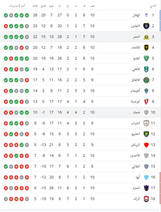 يحتل الهلال صدارة ترتيب الدوري السعودي برصيد 26 نقطة، بينما يحل التعاون في الوصافة بـ 23 نقطة، والنصر ثالث الترتيب بـ 22 نقطة، واتحاد جدة رابعًا بـ 20 نقطة.