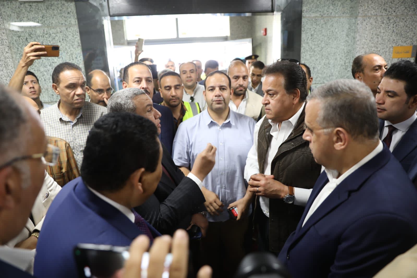 رافق الوزير خلال جولته، الدكتور أنور إسماعيل مساعد وزير الصحة والسكان للمشروعات القومية، والدكتور محمد ضاحي رئيس الهيئة العامة للتأمين الصحي، والدكتور محمد مصطفى عبدالغفار رئيس الهيئة العامة للمستشفيات والمعاهد التعليمية، والدكتور أحمد سعفان رئيس قطاع الطب العلاجي، والدكتورة مها إبراهيم رئيس أمانة المراكز الطبية المتخصصة، والدكتورة منن عبدالمقصود رئيس الأمانة العامة للصحة النفسية.