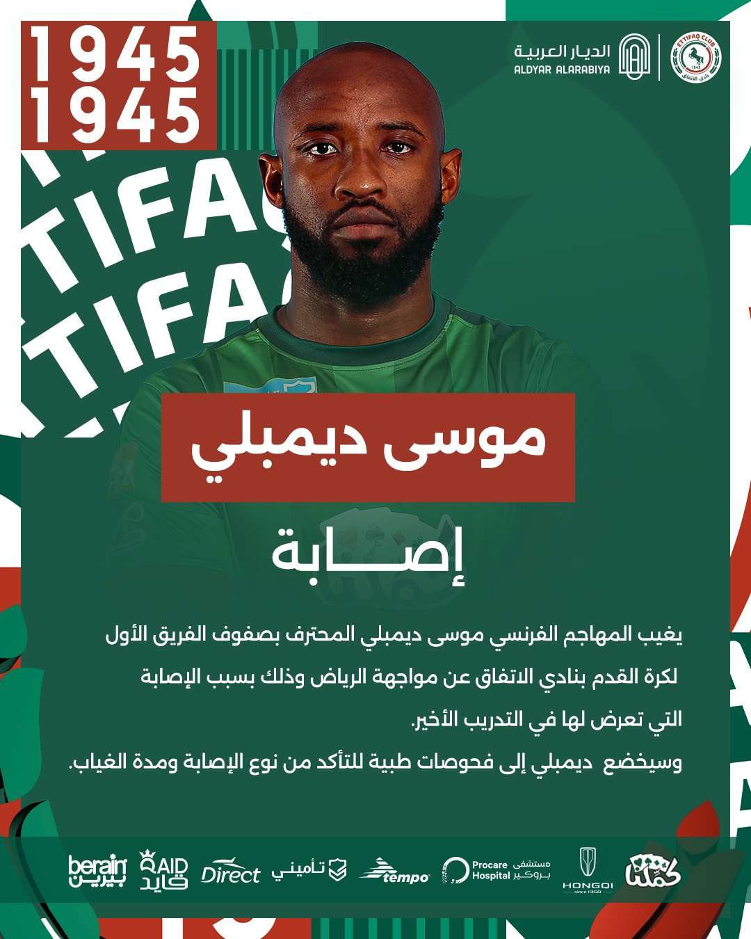 وكتب نادي الاتفاق من خلال حسابة الرسمي عبر مواقع التواصل الاجتماعي: "يغيب المهاجم الفرنسي موسي ديمبلي المحترف بصفوف الفريق الاول لكرة القدم بنادي الاتفاق عن مواجهة الرياض وذلك بسبب الإصابة التي تعرض لها في التدريب الاخير".