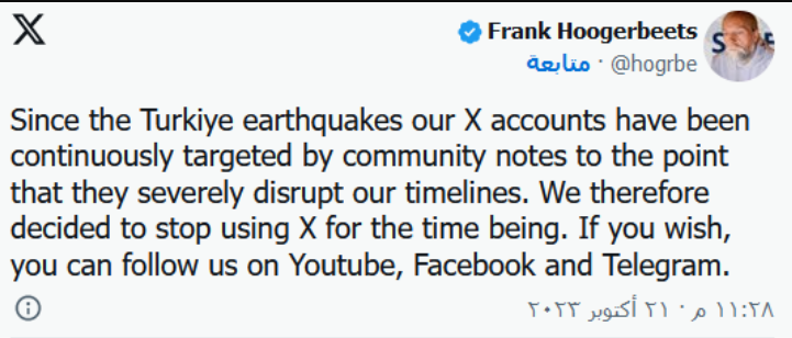 وأكد أنه منذ الزلزال، الذي توقعه حينها وتم استهداف حساباته الخاصة ليقرر التوقف عن استخدام المنصة في الوقت الحالي، مشيراً إلى أنه على الأشخاص المهتمين بآخر المستجدات المتعلقة بالزلازل القيام بمتابعته على كلا من تطبيق اليوتيوب وفيسبوك وتليجرام.