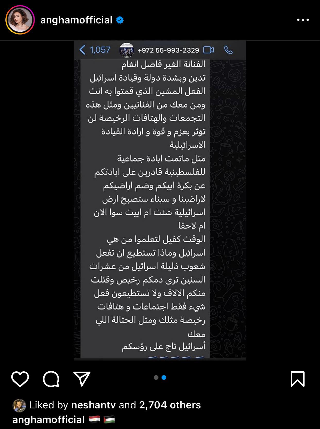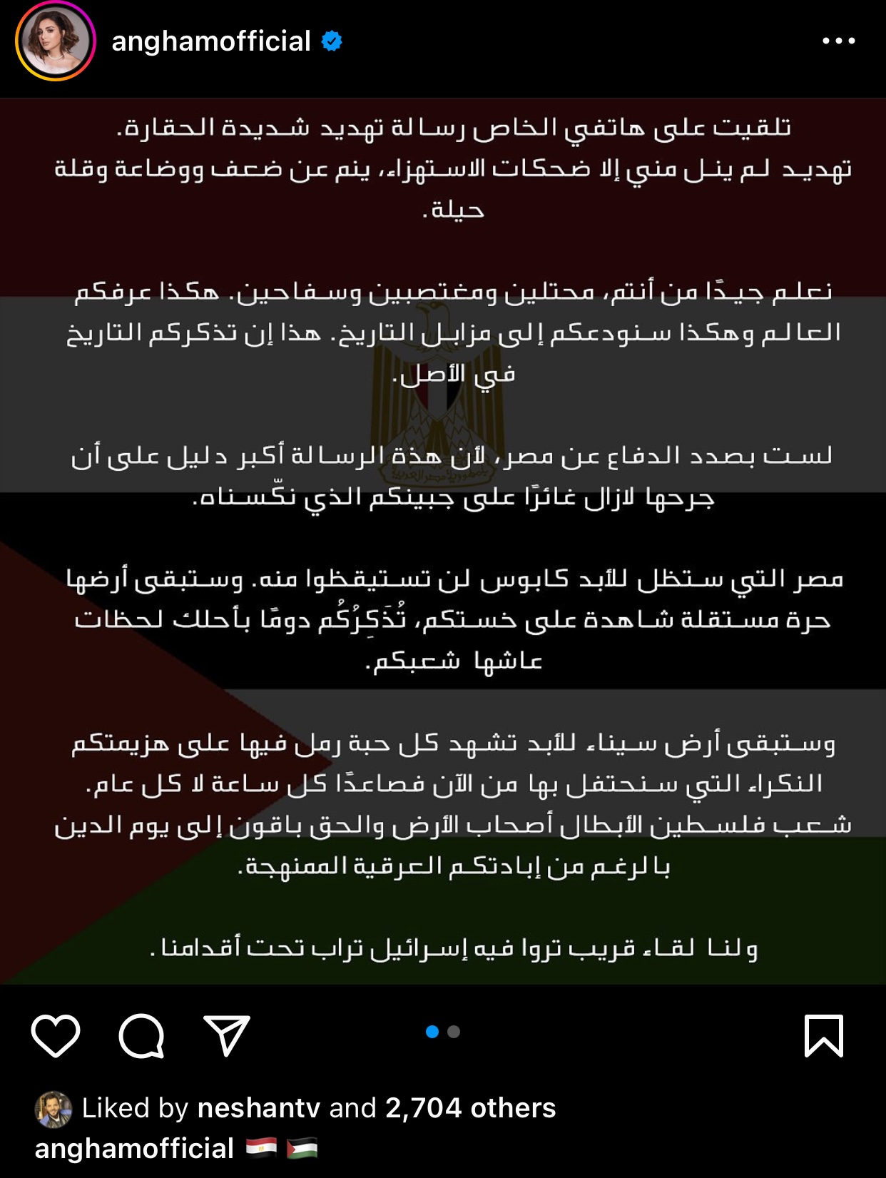 وأضافت رسالة تهديد الفنانة أنغام: "الوقت كفيل لتعلموا من هي إسرائيل وماذا تستطيع أن تفعل شعوب ذليلة إسرائيل من عشرات السنين ترى دمكم رخيص، وقتلت منك الآلاف ولا تستطيعون فعل شيء فقط اجتماعات وهتافات رخيصة مثلك ومثل الحثالة اللي معك، إسرائيل تاج على رؤوسكم".