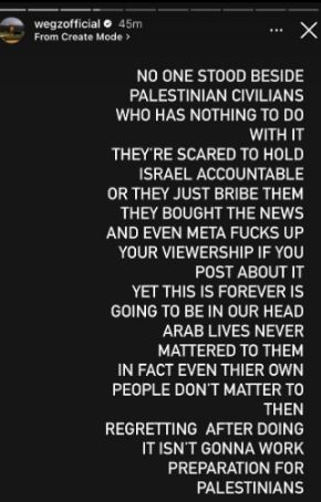 حرص مطرب الراب ويجز الشهير ويجز، على دعم الشعب الفلسطيني بعد الاعتداءات الوحشية عليه من قبل المُحتل الصهيوني، وذلك عبر حسابه الرسمي بموقع الصور والفيديوهات الشهير انستجرام.