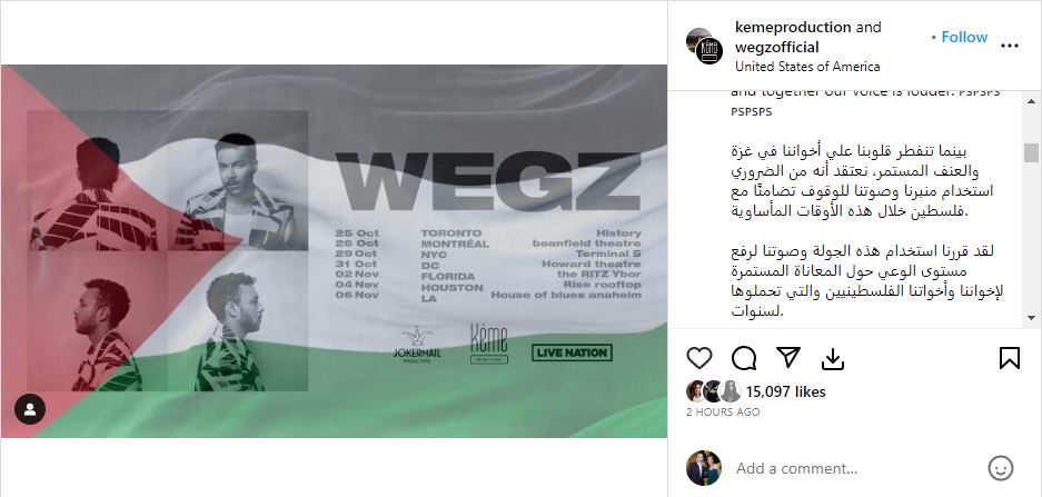 وتابع ويجز: "نعتقد أنه من الضروري استخدام منبرنا وصوتنا للوقوف تضامنًا مع فلسطين خلال هذه الأوقات المأساوية، ولقد قررنا استخدام هذه الجولة وصوتنا لرفع مستوى الوعي حول المعاناة المستمرة لإخواننا وأخواتنا الفلسطينيين والتي تحملوها لسنوات".