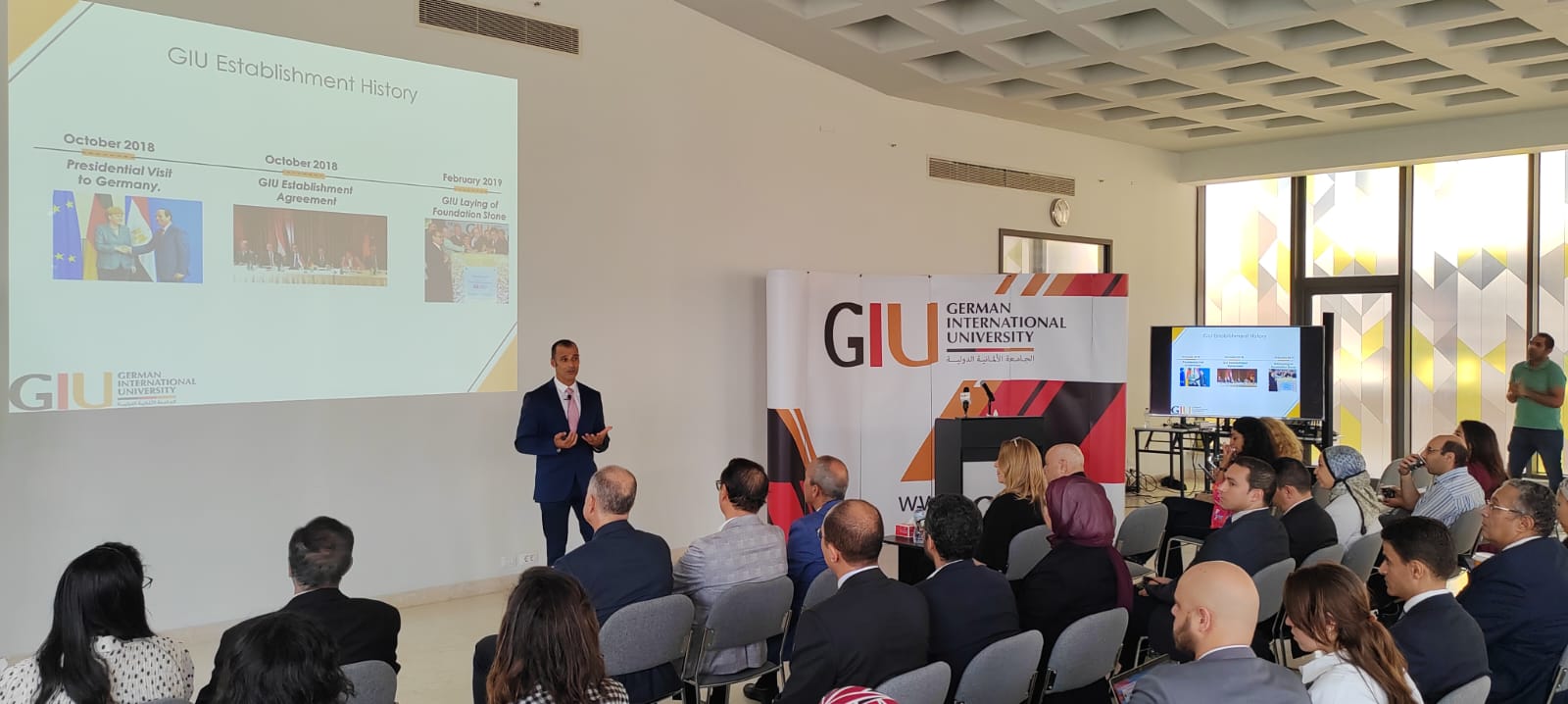 واستعرض الدكتور ياسر حجازى رئيس الجامعة الألمانية بالقاهرة الجهود التى  بذلتها الجامعة لإقامة هذا الحدث العلمي العالمي الهام للمرة الثانية فى رحابها وهذا ينبع من حرص الجامعة دوماً على تنظيم وإستقبال العديد من المؤتمرات الدولية التى تضم مجموعة متميزة من الخبراء والأكاديميين والباحثين المتخصصين ورجال الصناعة وصناع القرار للتحاور والتناقش وتبادل الآراء كجزء من سياستها لدعم إستراتيجية التدويل ، فالجامعة الألمانية بالقاهرة منصة علمية تعليمية بحثية تطبيقية رائدة تمتلك العديد من المقومات التقنية الكفيلة بإنجاح المؤتمرات الدولية التي تنظم في حرمها ، مشيراً إلى ان البحث العلمي هو جزء من حياة كل عضو في الجامعة و أحد ركائز تطورها ونجاحها .