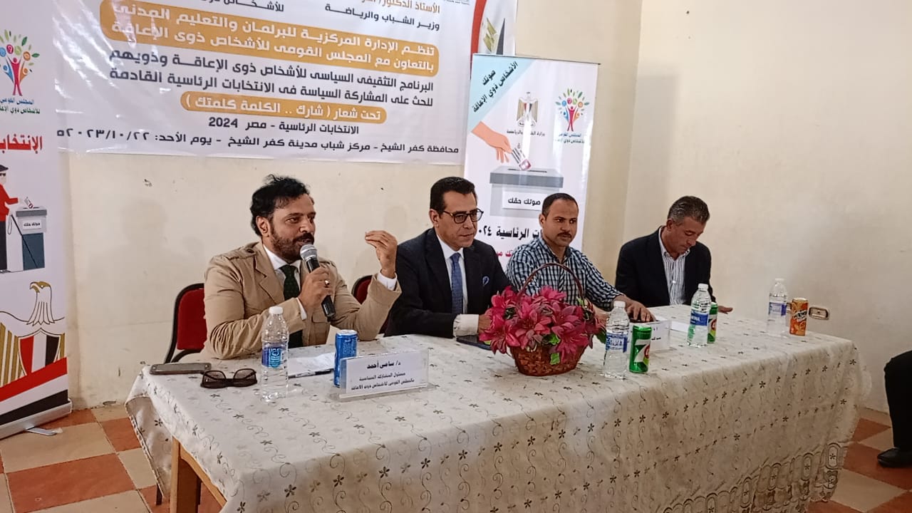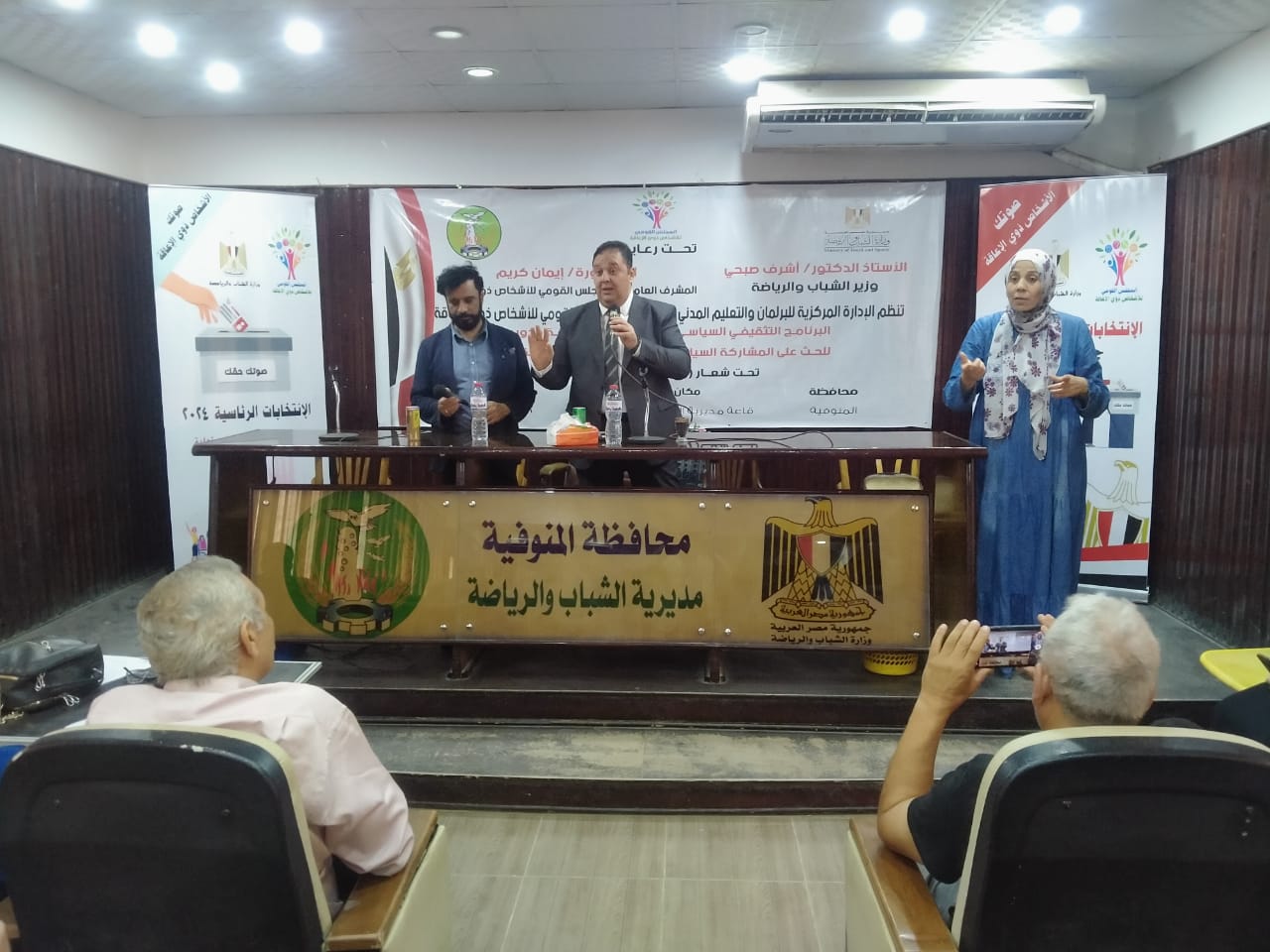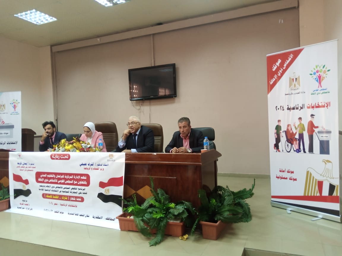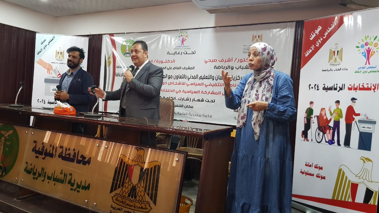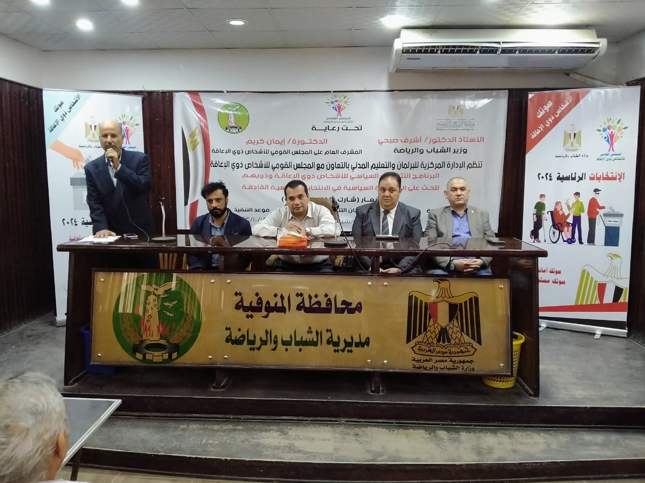 في إطار الحملة القومية لتعزيز المشاركة السياسية للأشخاص ذوي الإعاقة في الانتخابات الرئاسية 2024 ، واصلت وزارة الشباب والرياضة ، من خلال الإدارة المركزية للتعليم المدني ، وبالتعاون مع المجلس القومى للاشخاص ذوي الاعاقة ، عقد لقاءاتها التثقيفية تحت شعار " شارك ٠٠ الكلمة كلمتك " ، بــ 4 محافظات [ الإسكندرية ، كفرالشيخ ، القليوبية، المنوفية  ] ، تحت رعاية الدكتور أشرف صبحي وزير الشباب والرياضة .