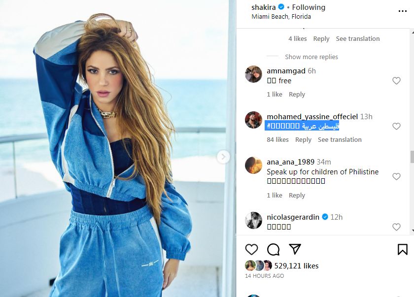 تفاعل متابعو المغنية اللبنانية شاكيرا مع أحدث إطلالاتها التي شاركتهم إياها عبر حسابها الشخصي بموقع الإنستجرام، وجاءت التعليقات معارضة لها: " ايش قصدها بالالوان علم اسرائيل؟، فليسطين عربية، لابسه علم اسرائيل ".