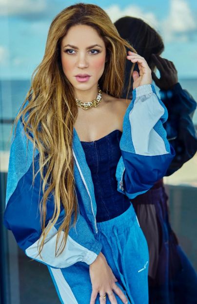 وبدت شاكيرا بإطلالة رياضية، حيث ارتدت كورسية أزرق وعليه ترينج فضفاض غلب عليه اللونين اللبني في الأزرق وكانها مستوحاه من علم دولة اسرائيل التي تشن حملات الدمار والخراب على الفلسطنين منذ عدة أيام.