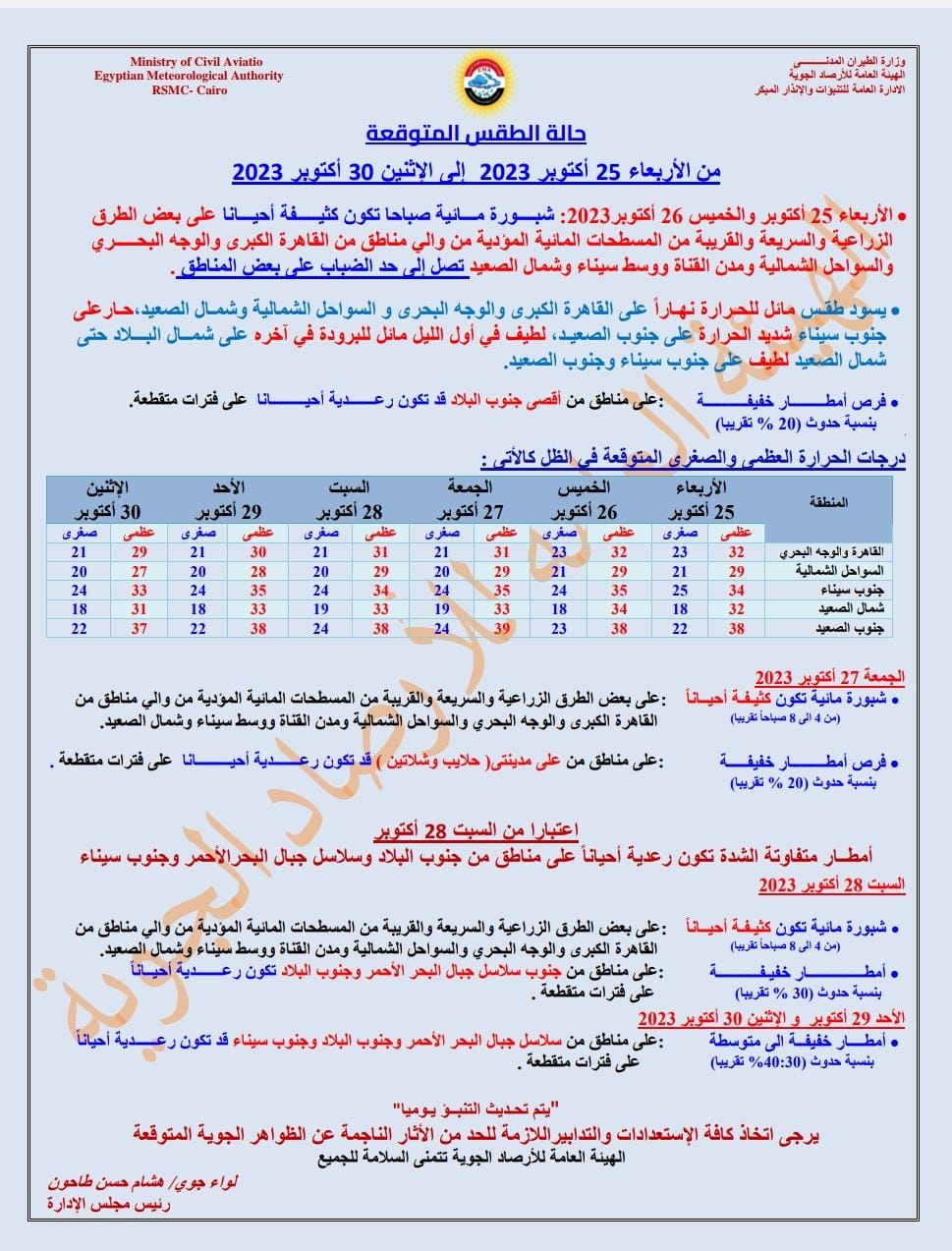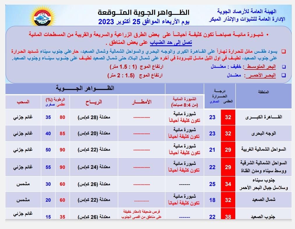 وأوضحت الهيئة العامة للأرصاد الجوية، أنه من المتوقع أن يسود طقس مائل للحرارة نهارًا على القاهرة الكبرى والوجه البحري والسواحل الشمالية وشمال الصعيد، ويكون حار على جنوب سيناء وشديد الحرارة على جنوب الصعيد، ويكون لطيف في أول الليل مائل للبرودة في آخره.