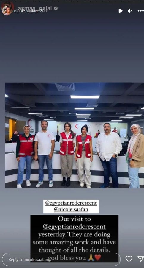 نشرت نيكول سعفان صورتها من داخل الهلال الأحمر المصري، برفقة الفنانة أسماء جلال، عبر حسابها الشخصي بموقع "انستجرام".
