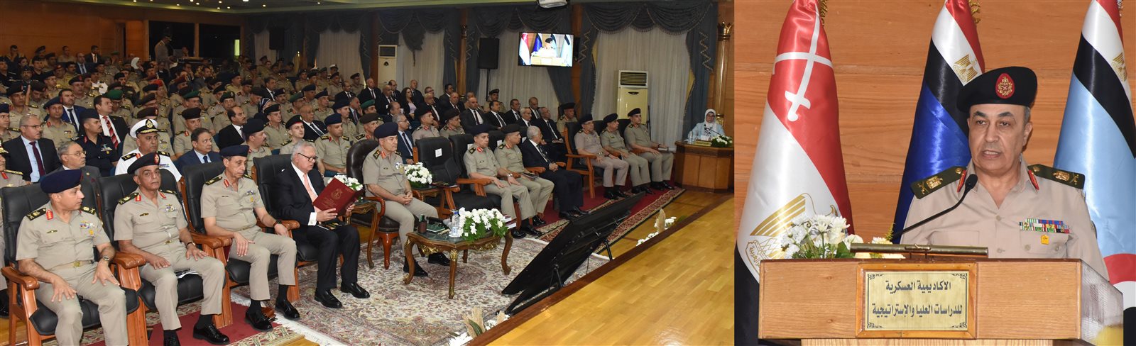 وألقى اللواء أ.ح أشرف فارس مدير الأكاديمية العسكرية للدراسات العليا والإستراتيجية كلمة قدم خلالها الشكر للقيادة العامة للقوات المسلحة التى قدمت كافة أوجه الدعم والمساندة للإرتقاء بالمستوى العلمى لدارسى الأكاديمية، مشيراً إلى الجهود المبذولة والتعاون المستمر بين القوات المسلحة وجميع الأجهزة المعنية لزيادة الوعى المجتمعى لما له من أهمية فى خلق نسيج وطنى متكامل داخل الدولة المصرية .