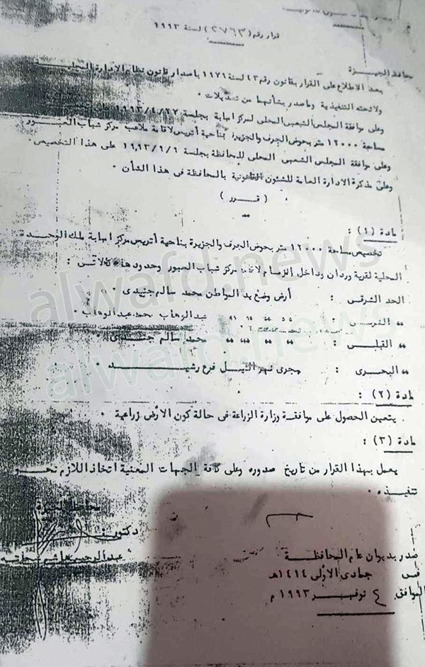 قرار تخصيص قطعة الأرض كملعب