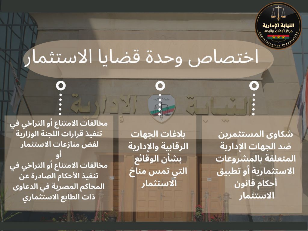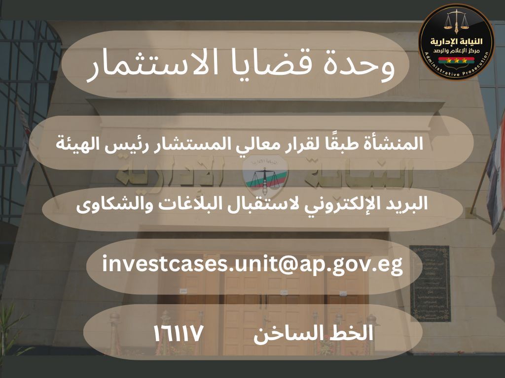 أعلنت هيئة النيابة الإدارية اختصاص وآليات التواصل مع "وحدة قضايا الاستثمار" بالنيابة الإدارية، والتي تختص بإجراء الفحص والتحقيق في موضوعات الشكاوى والبلاغات وثيقة الصلة بالاستثمار وتشمل:-