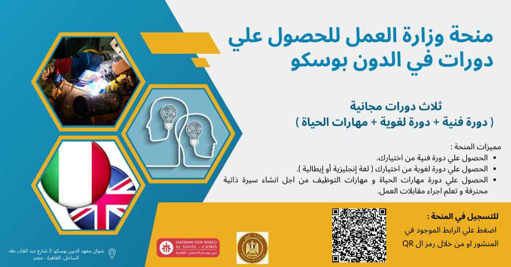 أعلنت وزارة العمل اليوم الأربعاء عن فتح باب التقديم للحصول على منحة مجانية مُقدمة للشباب من الجنسين للتدريب على 23 مهنة من خلال 3 برامج في مجالات فنية، ولغوية،ومهارات حياة، وذلك بالتعاون مع معهد السالزيان "الدون بوسكو" الإيطالي بالقاهرة، فى إطار بروتوكول تعاون مشترك بين "الوزارة" و"المعهد"، يهدف إلى تبادل الخبرات في مجال التدريب المهني، وتعزيز الكفاءة، والقدرة التنافسية للخريجين للمُتدربين، والباحثين عن العمل في المجالات الفنية،والحِرفية، وفقًا لمعايير المحلية والدولية.