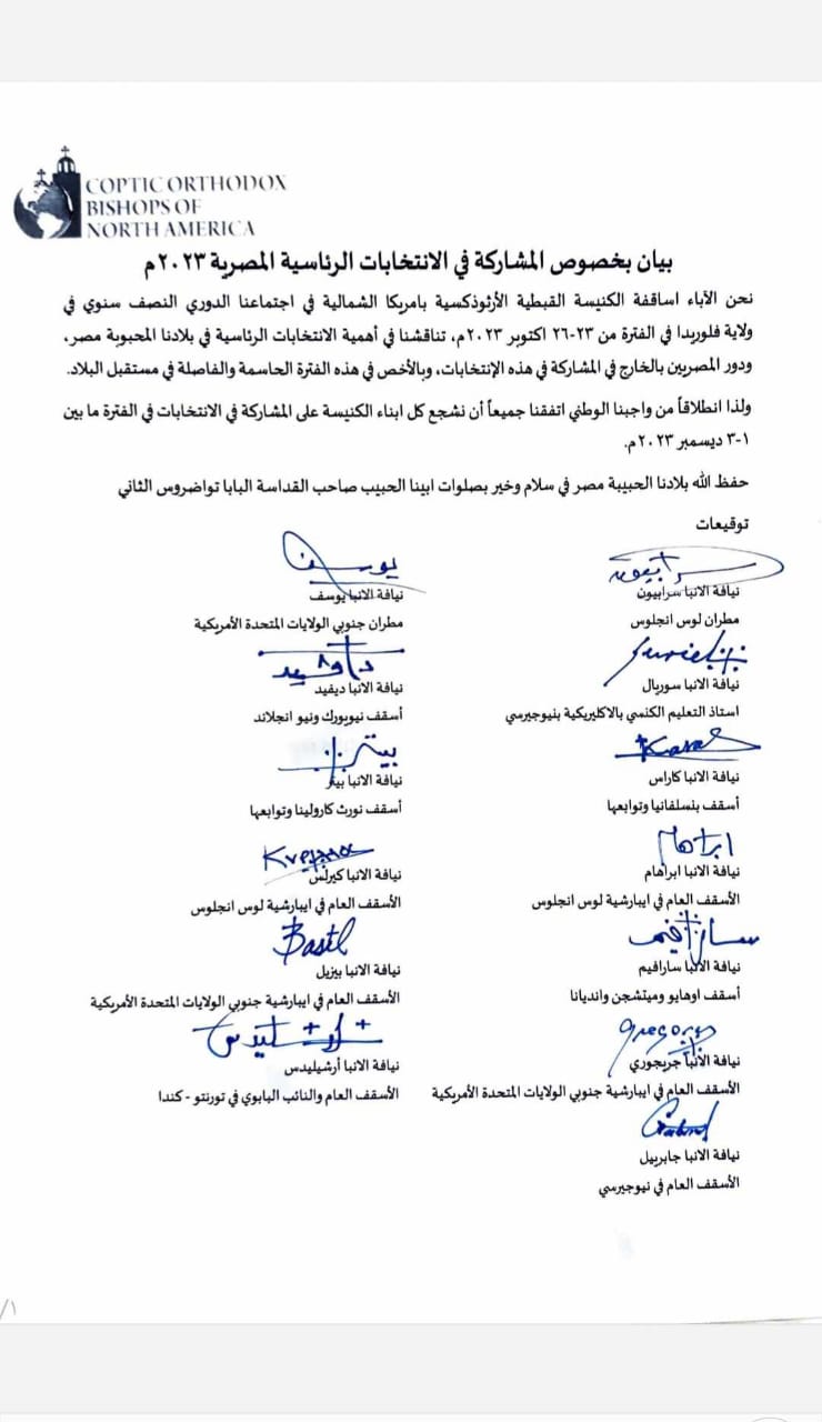 وتوجه رأفت صليب مسؤول حملة مواطن لدعم مصر "كن مع الوطن" بالولايات المتحدة الأمريكية بالشكر للآباء الأساقفة على هذه الدعوة مؤكدا أنها سيكون لها أثر كبير في المشهد الانتخابي المصري بالولايات المتحدة الأمريكية نظرا لما للآباء الأساقفة من مكانة في نفوس أبناء شعب الكنيسة القبطية.