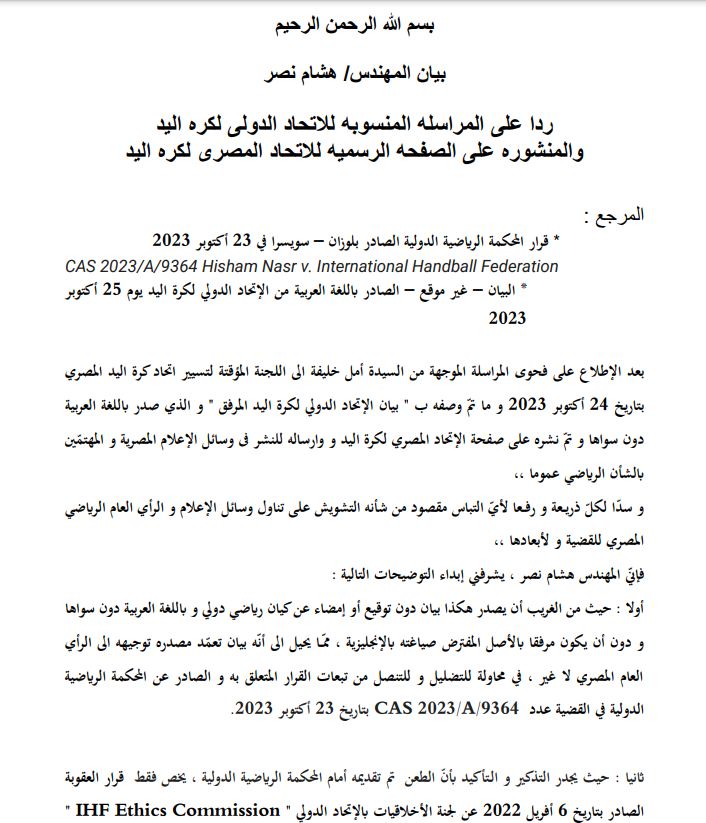 هشام نصر يُصدر بيانًا ناريًا ردًا على الاتحاد الدولي لكرة اليد