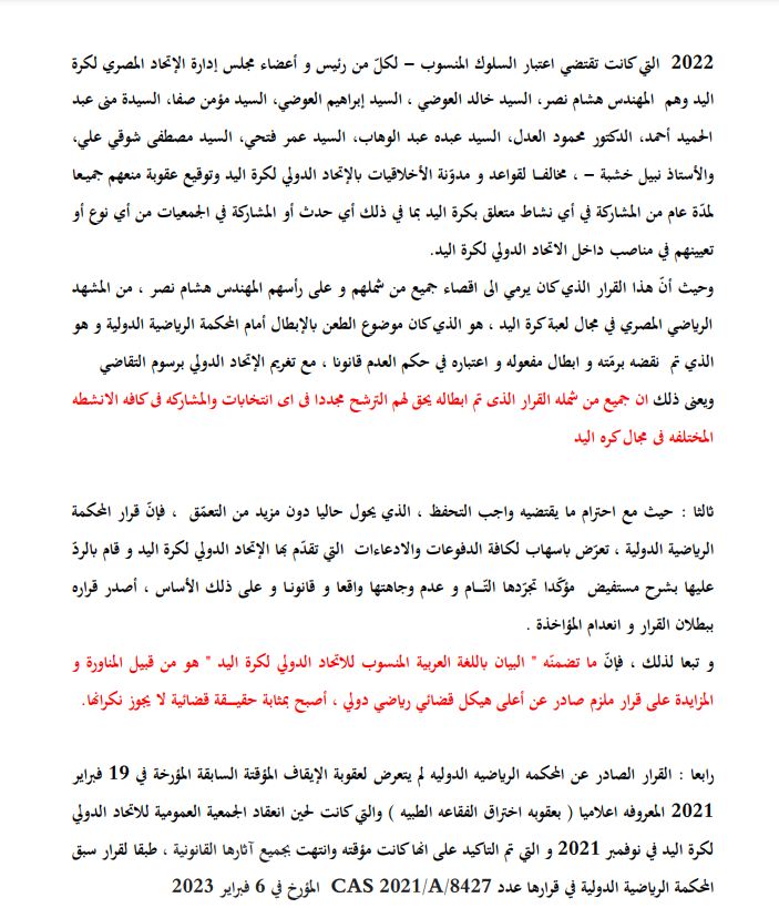 وشهدت الساعات الأخيرة صدور قرار رسمي من المحكمة الرياضية الدولية (CAS) بشأن القضية المرفوعة من هشام نصر، رئيس الاتحاد المصرى لكرة اليد السابق، ضد الاتحاد الدولى لكرة اليد، والتي أنصفت دعوى هشام نصر وإلغاء قرار الاتحاد الدولي لكرة اليد بإيقافه ومجلسه لمدة عام.