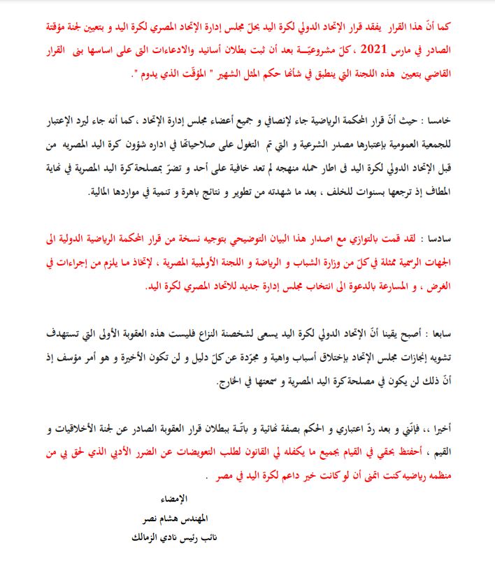 أصدر نائب رئيس نادي الزمالك الحالي ورئيس الاتحاد المصري لكرة اليد السابق بيانًا ناريًا منذ قليل ردًا على بيان الاتحاد الدولي لكرة اليد، وذلك بعد قرار المحكمة الرياضية "كاس" بشأن إلغاء إيقاف هشام نصر ومجلسه.