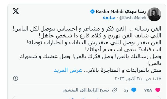 واختتمت رسالتها قائلة: "وصل رسالتك بالفن! وصل فكرك بالفن! وصل غضبك وشعورك بالفن، مش بالمزايدات والمتاجرة بآلام الناس".