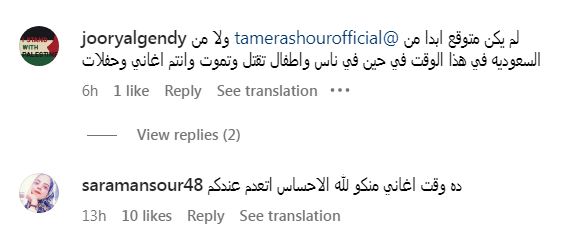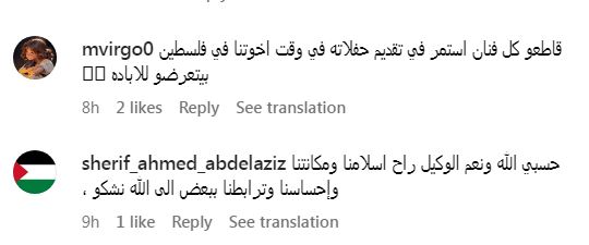تشتت الحديث في التعليقات على دعاية الحفلات بين من يسأل على كيفية مشاهدتها، وبين معارض على استمرارها على الرغم من أن المشاهد المفجعة في فلسطين، وما يمر به الشعب الفلسطيني في مواجهة موتاهم وجرحاهم وركام منازلهم، وآخرون من ينجمون في مطربهم المفضل ويعلن سعادته بالحفل.