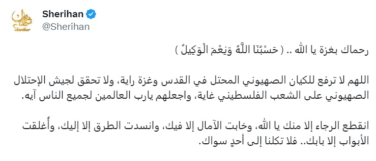 وكتبت النجمة شريهان، في تدوينة عبر حسابها قائلة : "رحماك بغزة يا الله.. ﴿ حَسْبُنَا اللَّهُ وَنِعْمَ الْوَكِيلُ ﴾، اللهم لا ترفع للكيان الصهيوني المحتل في القدس وغزة راية، ولا تحقق لجيش الاحتلال الصهيوني على الشعب الفلسطيني غاية، واجعلهم يا رب العالمين لجميع الناس آية".