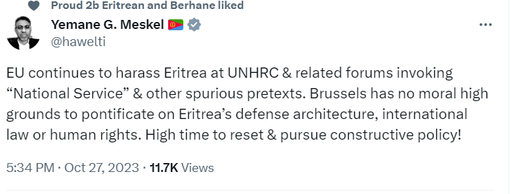 وغرد وزير الإعلام الإريتري، عبر منصة التواصل الاجتماعي “إكس”، قائلًا:" يواصل الاتحاد الأوروبي مضايقة إريتريا في مجلس حقوق الإنسان التابع للأمم المتحدة والمنتديات ذات الصلة متذرعًا بـ "الخدمة الوطنية" وغيرها من الذرائع الزائفة".