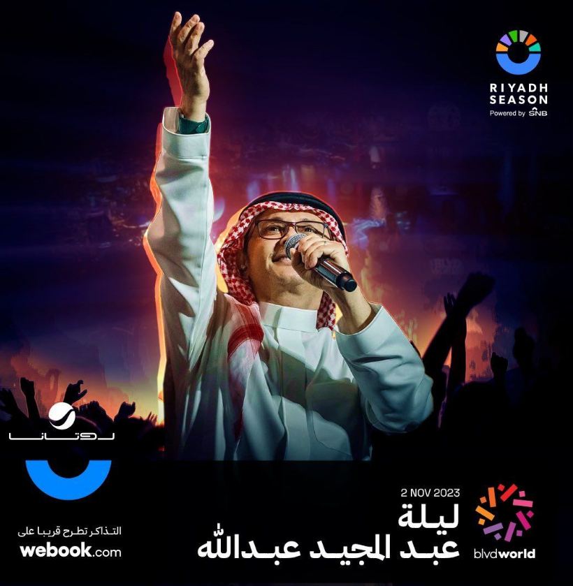 يبدأ الفنان الكبير عبد المجيد عبد الله الفعاليات الغنائية للنسخة الرابعة من موسم الرياض 2023، وذلك بحفل غنائي على أحد مسارح الموسم الكبرى.