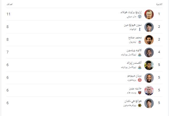 يمتلك هالاند 11 هدف في المركز الأول، ويأتي خلفه محمد صلاح نجم ليفربول وهيونج مين سون مهاجم توتنهام برصيد 8 أهداف، وجاء الترتيب كالتالي:-