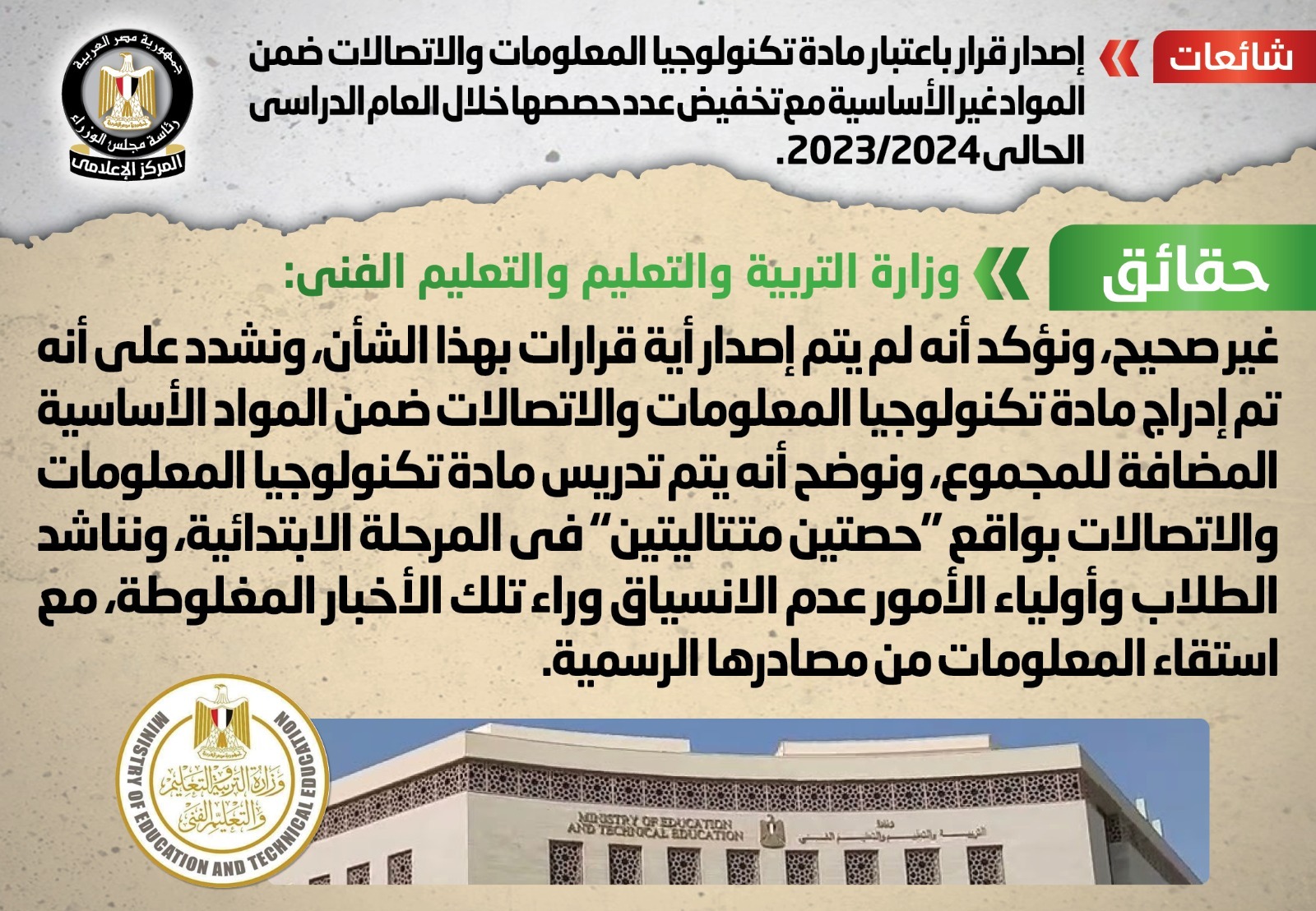 نفى المركز الإعلامي بمجلس الوزراء ما تداولت بعض المواقع الإلكترونية وصفحات التواصل الاجتماعي أنباء بشأن  إصدار قرار باعتبار مادة تكنولوجيا المعلومات والاتصالات ضمن المواد غير الأساسية مع تخفيض عدد حصصها خلال العام الدراسي الحالي 2023/2024.
