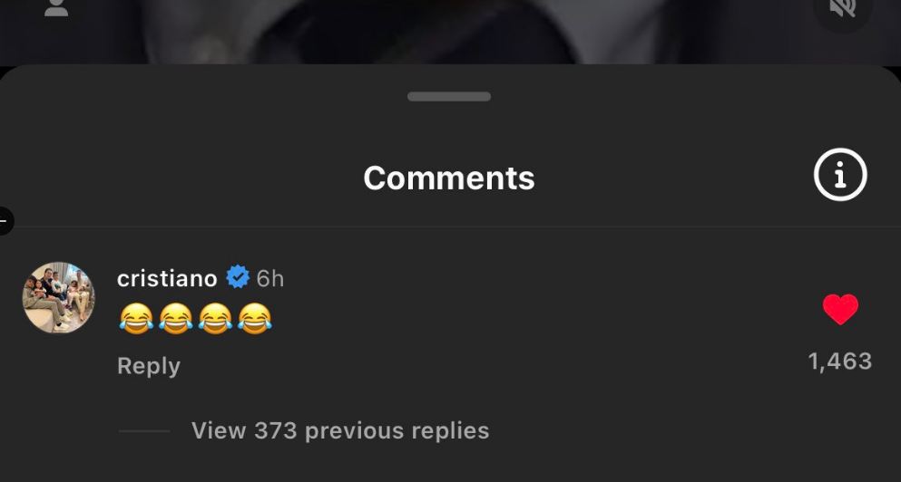 أظهر رونالدو رد فعله على حصول ميسي على الكرة الذهبية وعلق على منشور صديقة الصحفي الإسباني عبر تطبيق "إنستجرام"، وذلك من خلال رموز تعبيرية ضاحكة ساخرة، مما أثار الجدل حول رأيه بشأن التتويج بالجائزة.