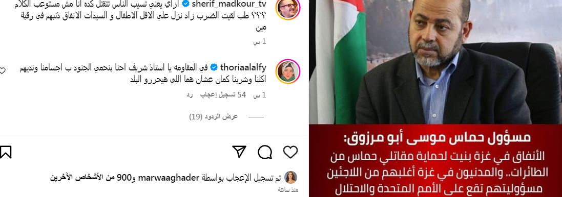 نشر الإعلامي شريف مدكور منشور عبر حسابه الشخصي بموقع تبادل الصور والفيديوهات إنستجرام يكشف فيه نوايا حركة حماس وموقفها ناحية المدنيين الفلسطينيين، موضحًا أن "أبو مرزوق" يخلي مسؤليته عن المدنيين.