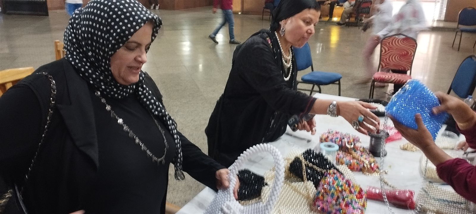 وأبدتا نظرة اعجاب بانتاج ورشة الشنط بالشبك التى تقدمها نجلاء شحاته، وورشة تعليم الشنط بالخرز التى تقدمها منى عبد الوهاب.