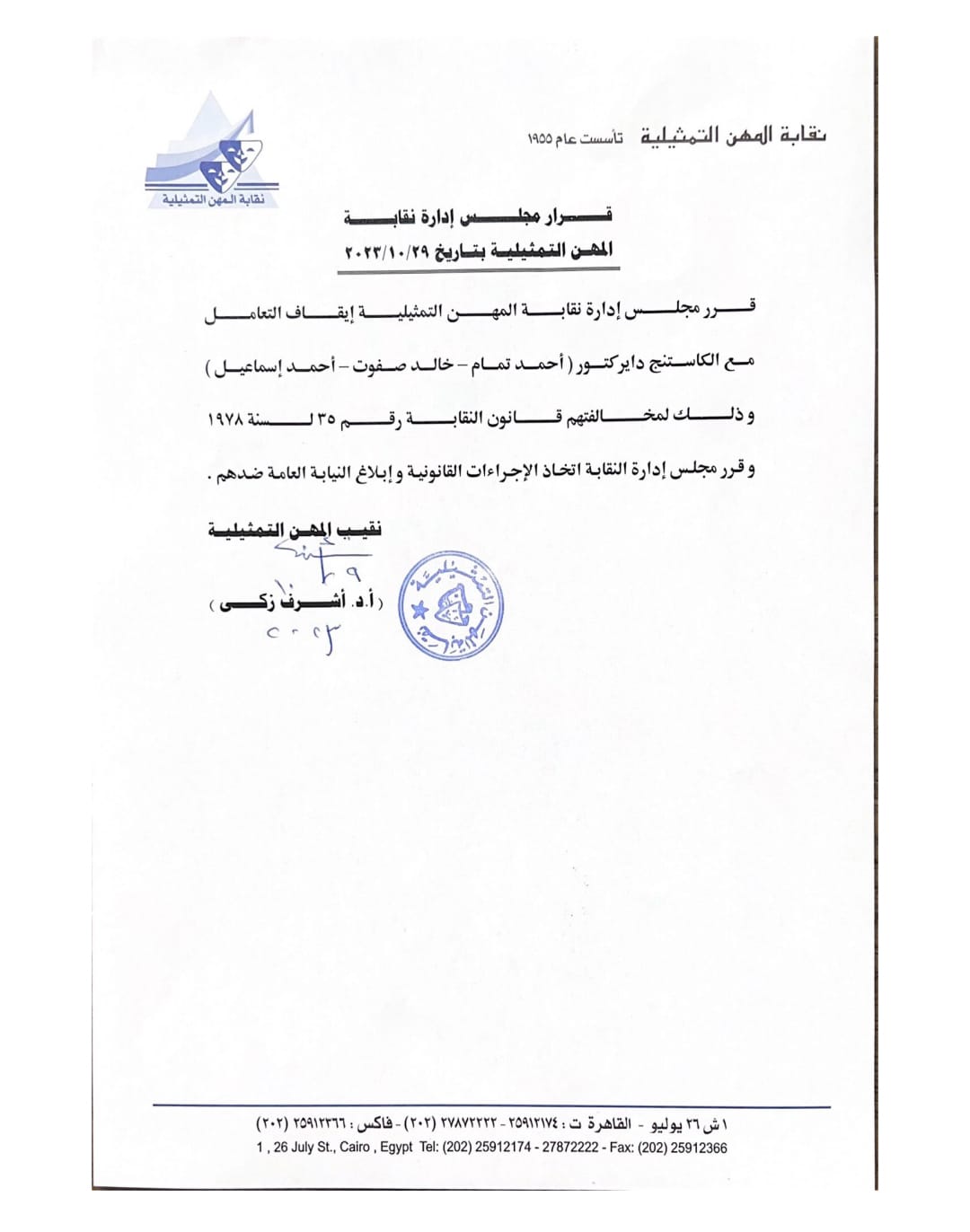 "قرر مجلس إدارة نقابة المهن التمثيلية إيقاف التعامل مع الكاستنج دايركتور (أحمد تمام وخالد صفوت وأحمد إسماعيل)، وذلك لمخالفتهم قانون النقابة رفم 25 لسنة 1978، وقرر مجلس إدارة النقابة اتخاذ الإجراءات القانونية وإبلاغ النيابة العامة ضدهم".