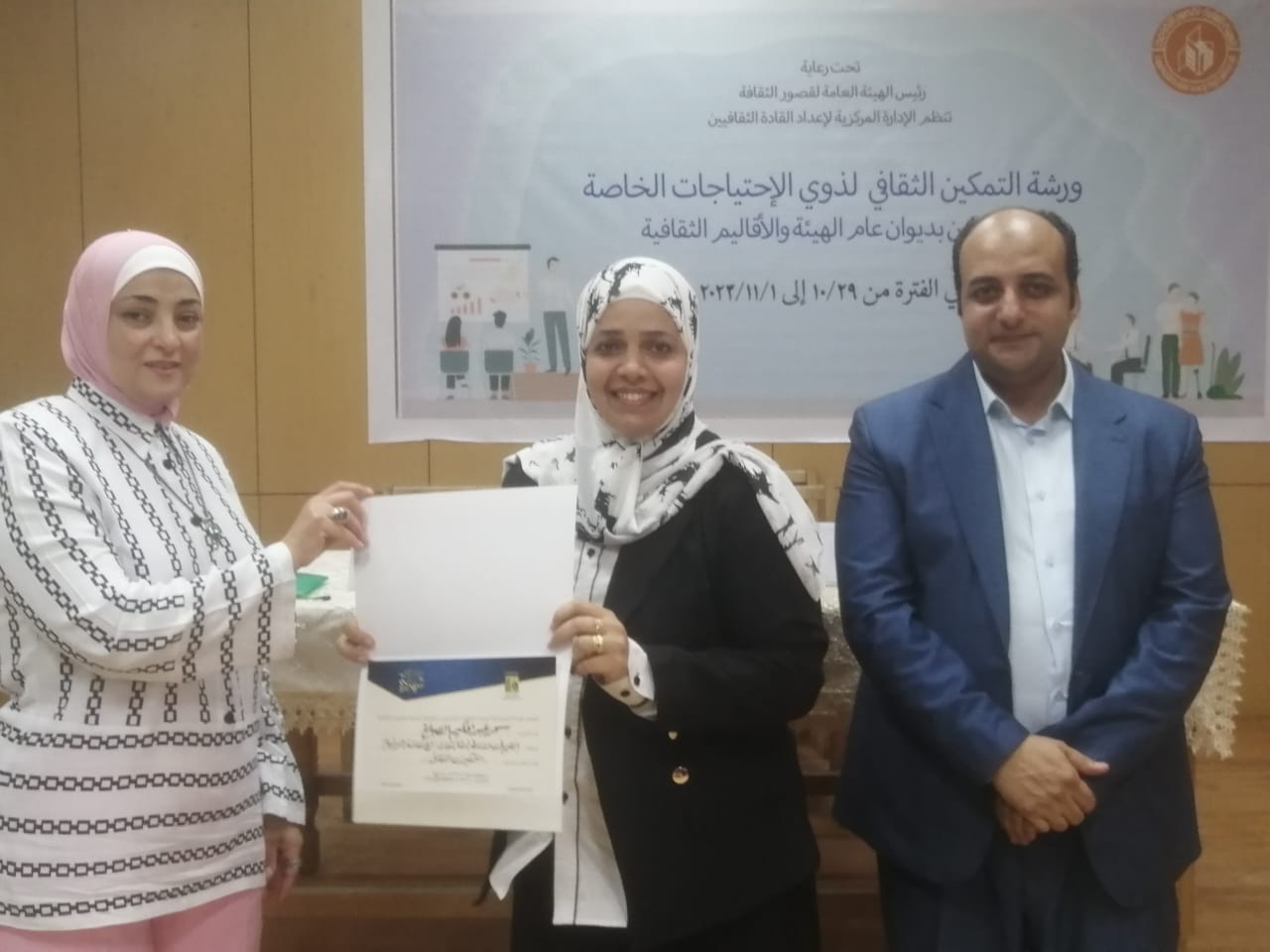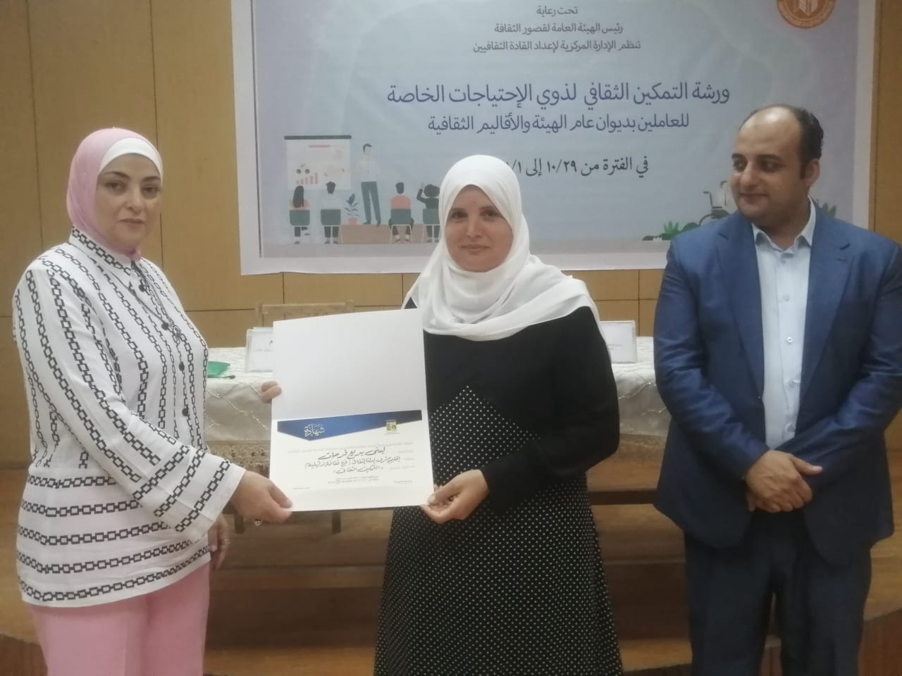 اختتمت الهيئة العامة لقصور الثقافة برئاسة عمرو البسيوني، فعاليات الورشة التدريبية "إعداد مسئول تمكين ثقافي "لذوي القدرات الخاصة، والتى نظمتها الإدارة المركزية لإعداد القادة الثقافيين برئاسة د. منال علام، للعاملين بالأقاليم الثقافية "شرق الدلتا، القناة وسيناء، القاهرة الكبرى وشمال الصعيد، غرب ووسط الدلتا" والفروع التابعة لها وذلك بمقر الإدارة بمصر الجديدة.