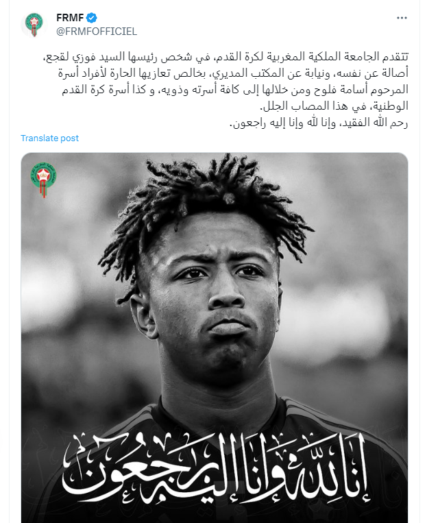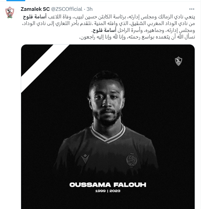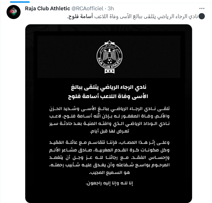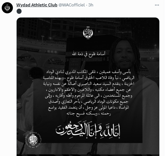 يذكر أن نادي الوداد المغربي أعلن خلال الساعات الأخيرة لأمس الخميس وفاة لاعبه أسامة فلوح، ونعاه عبر "إكس"، وقال:"بأسى وأسف عميقين تلقى المكتب المديري (مجلس إدارة) نادي الوداد الرياضي نبأ وفاة اللاعب الخلوق أسامة فلوح، بهذه المناسبة الحزينة، يتقدم السيد سعيد الناصيري أصالة عن نفسه ونيابة عن جميع أعضاء مكتبه، واللاعبين والاطقم والاداريين، وجميع المستخدمين، الى عائلة المرحوم وأهله وأقاربه، وإلى جميع مكونات الوداد الرياضي، بأحر التعازي وأصدق المواساة، داعيًا المولى عز وجل، أن يتغمد الفقيد بواسع رحمته، ويسكنه فسيح جناته، وإنا لله وإنا إليه راجعون".