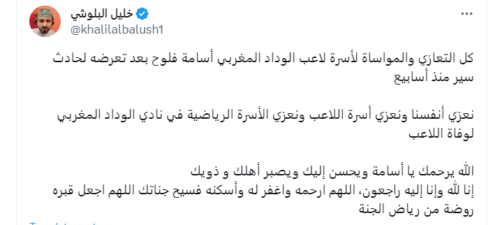 فيما شارك المعلق الرياضي العماني "خليل البلوشي" في دفتر العزاء المقام على "إكس"، وكتب:" كل التعازي والمواساة لأسرة لاعب الوداد المغربي أسامة فلوح بعد تعرضه لحادث سير منذ أسابيع ..نعزي أنفسنا ونعزي أسرة اللاعب ونعزي الأسرة الرياضية في نادي الوداد المغربي لوفاة اللاعب ".